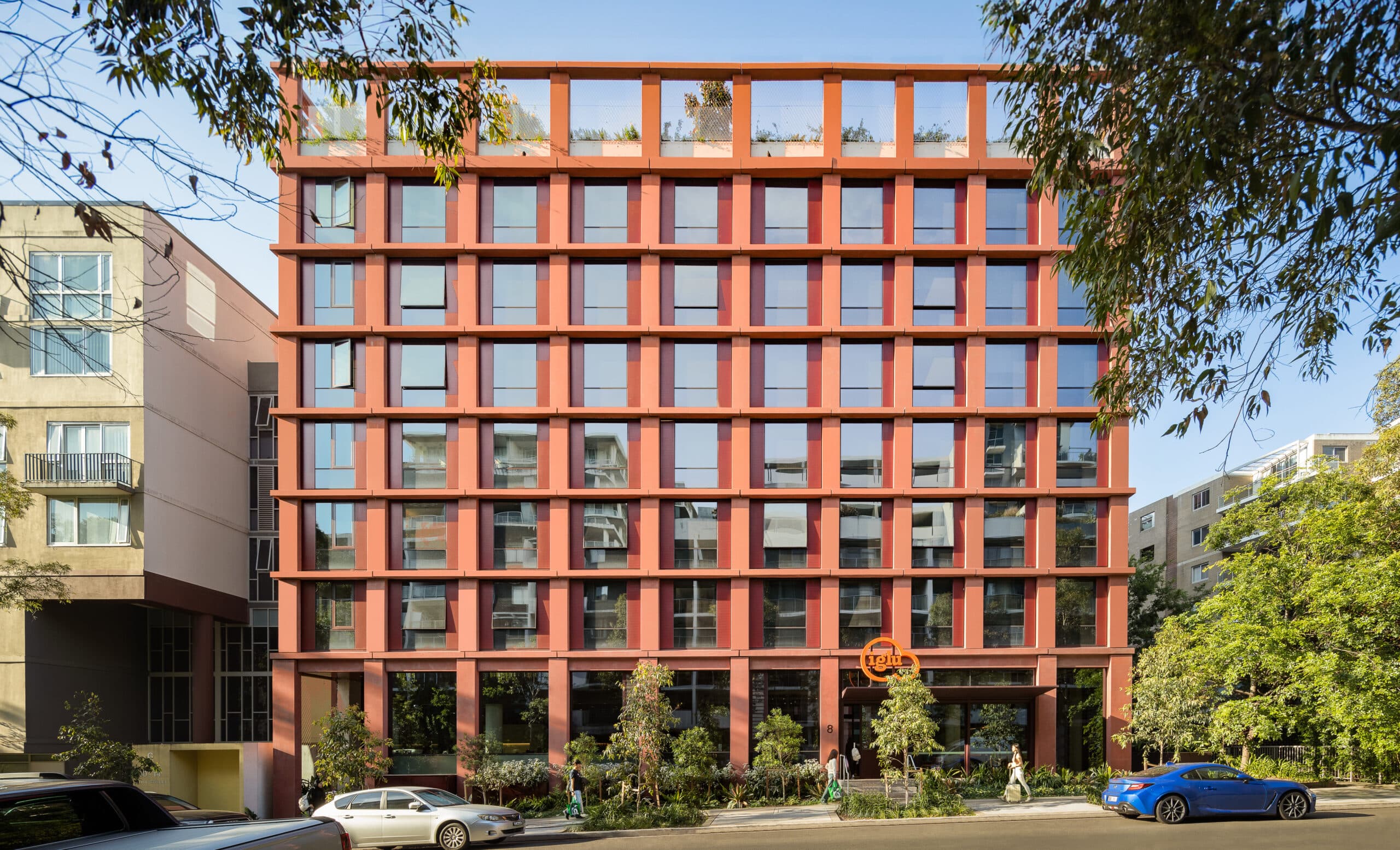 Colour works with the grid: each volume has its own two colours, a lighter colour for the matt pigmented concrete, and a darker colour for the glossy metal infill panels that sit between the vertical piers and windows. We drew all colours from Mascot’s older homes and brick warehouses. When read together, they create a tonal composition the unifies the whole building while creating depth and texture.