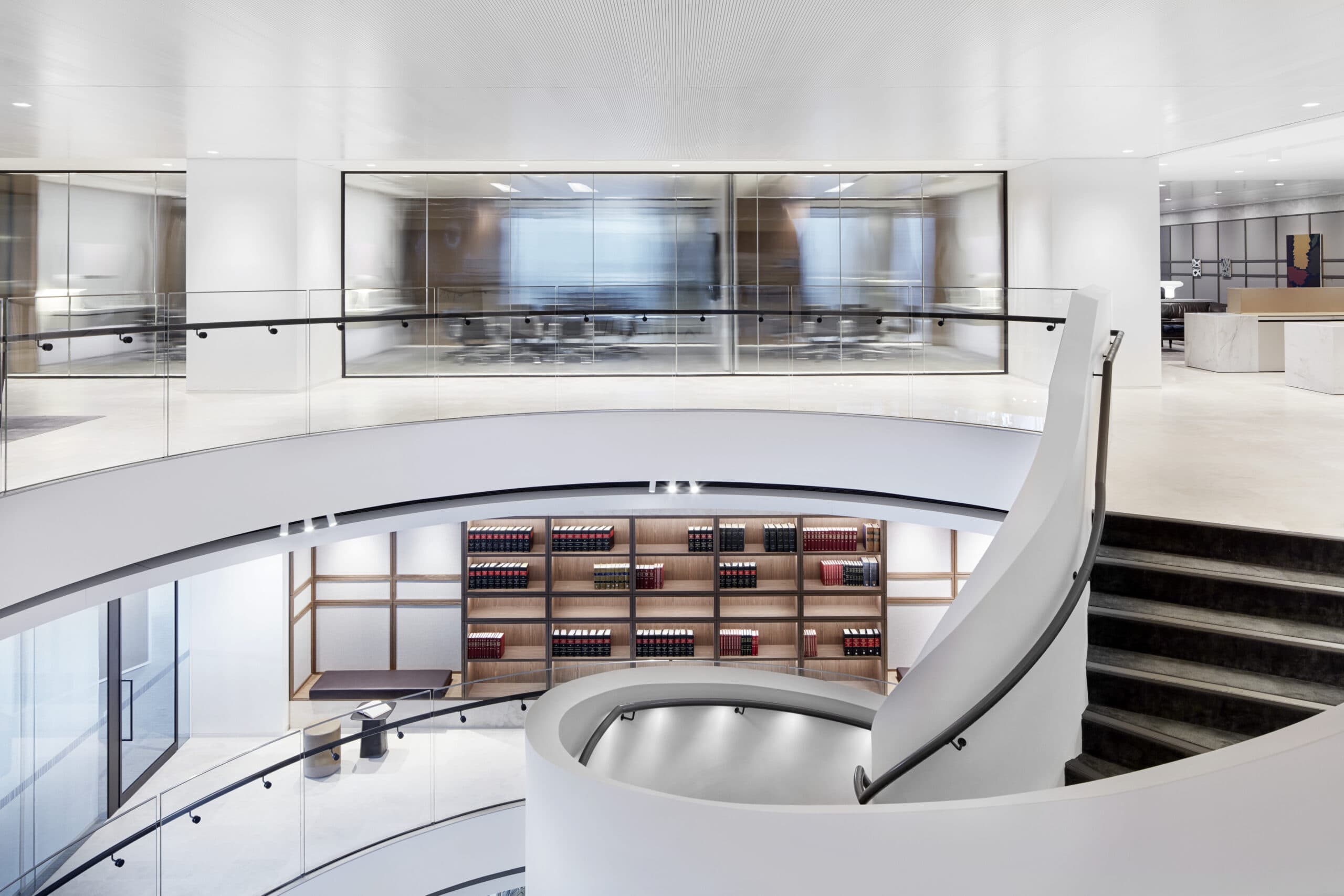Spanning three levels, the generous floor plates are linked by a dramatic spiral staircase that connects and forms the central heart of the workplace. Collaborative zones, such as the library and reading booths, encircle the staircase providing areas for further reflection and connectivity.