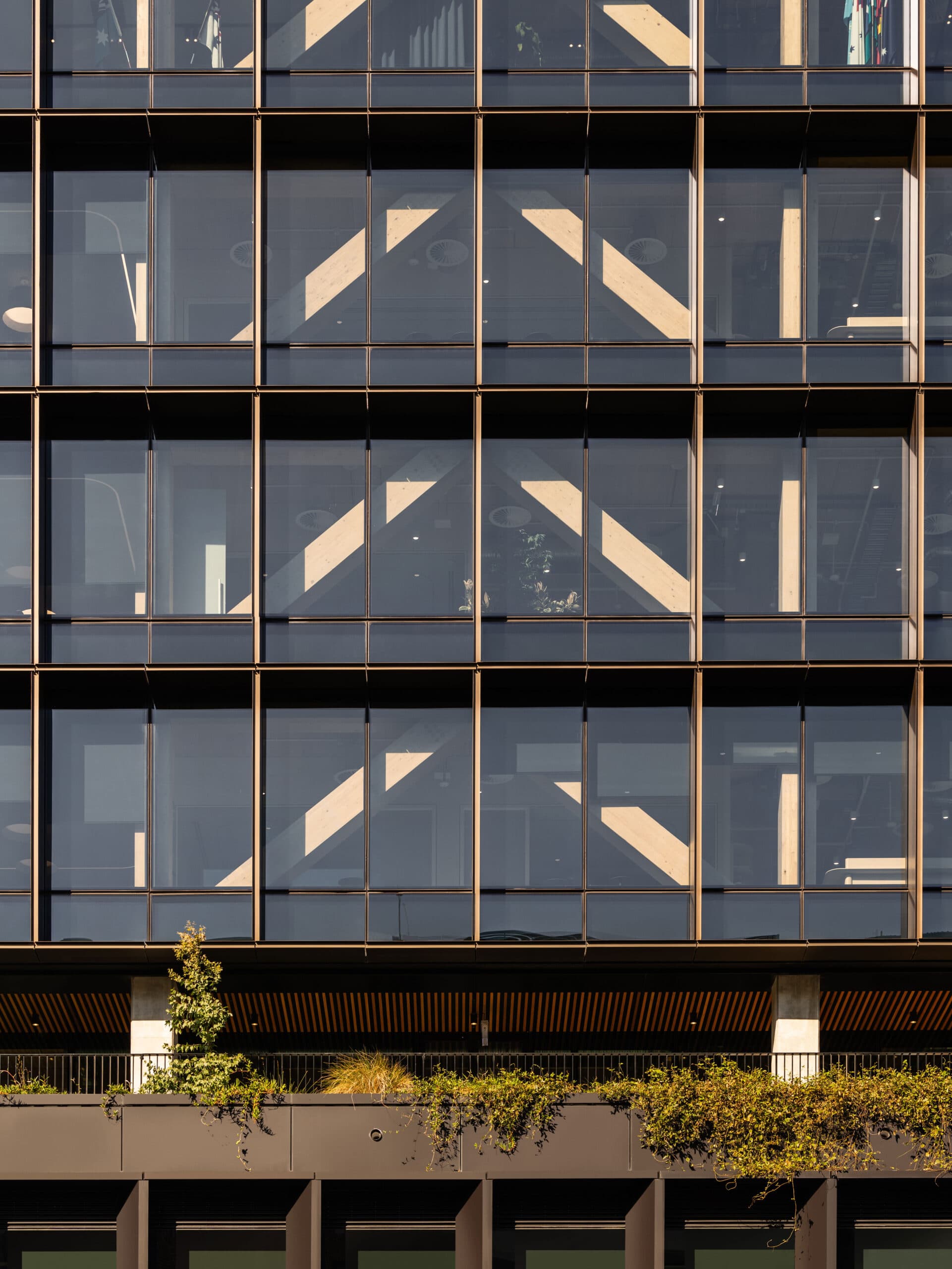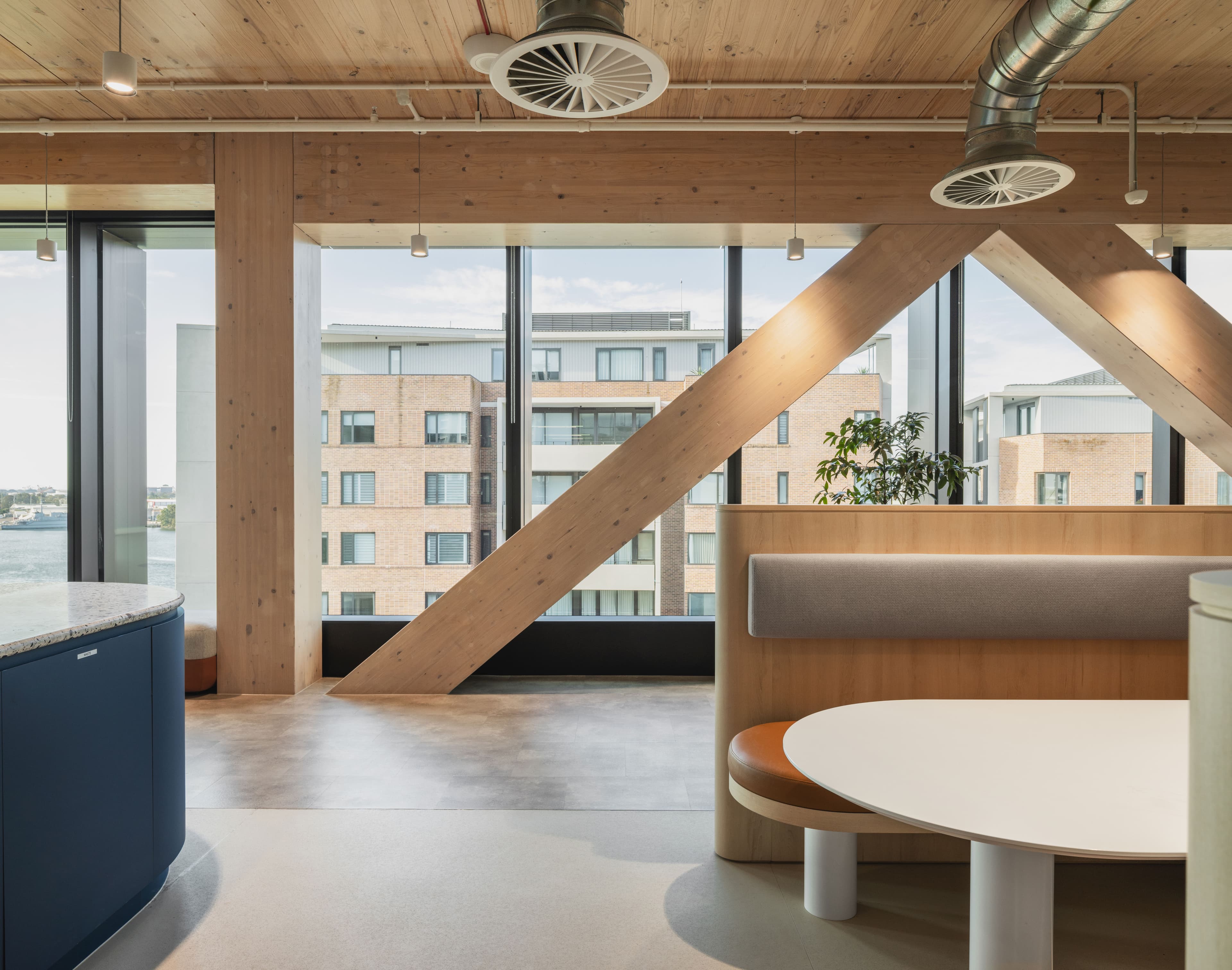 The commercial building employs cross-laminated timber floors and Glulam beams and columns. At ground, a café activates Honeysuckle Drive with north-facing outdoor dining. Above, side-core floorplates enable open, flexible layouts with daylight and views to Newcastle CBD.