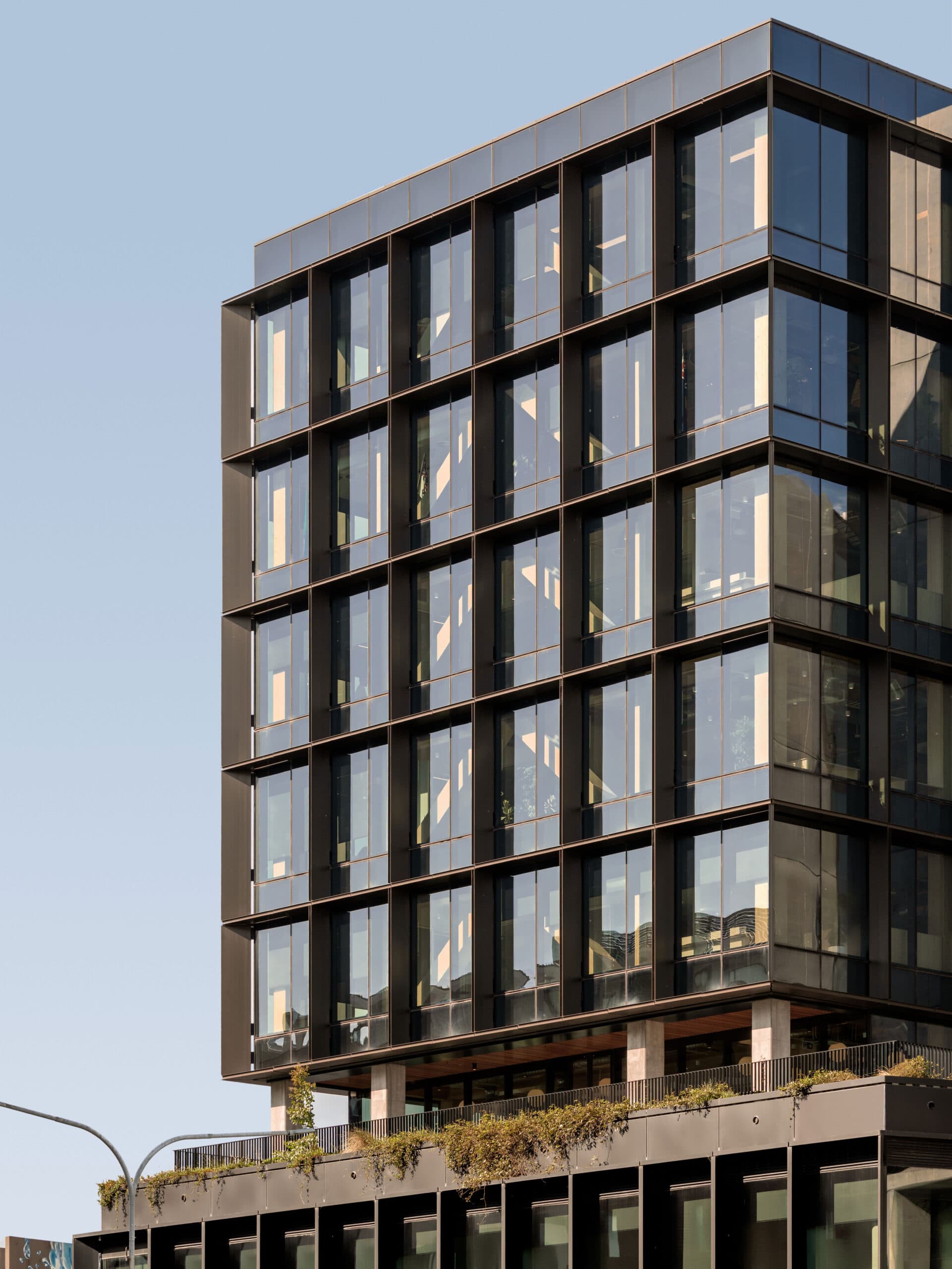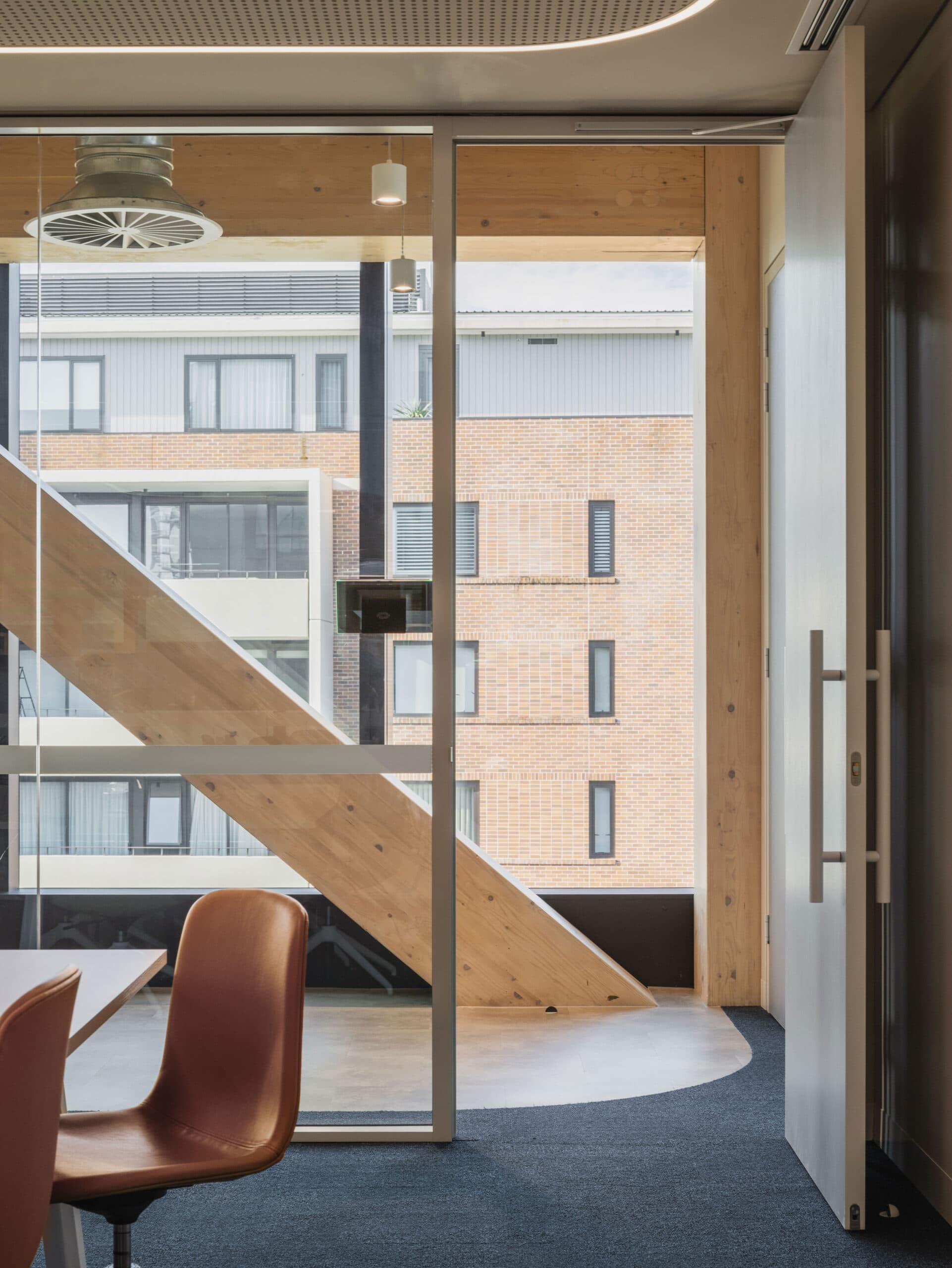 Façades celebrate programmatic differences while maintaining a consistent palette. The precinct is fully electrified and incorporates on-site solar PV and high-performance passive design. The CLT/GLT structure significantly reduces embodied carbon, positioning 42 Honeysuckle Drive as a leading example of low-impact urban development in Newcastle.