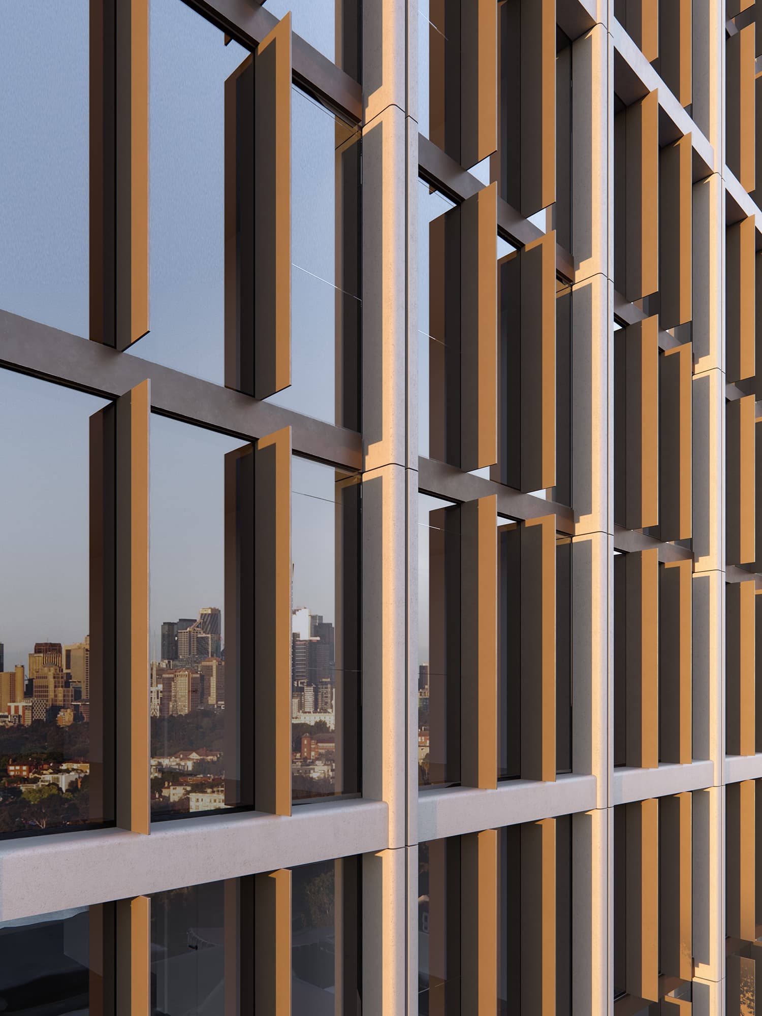 In the podium levels, additional solidity and texture is introduced in sculpted piers. This combines with filigree bronze aluminium details to provide a human scale to the street and a welcome sense of belonging for residents. Beyond the community space, other podium uses include retail, commercial and residential amenities.
