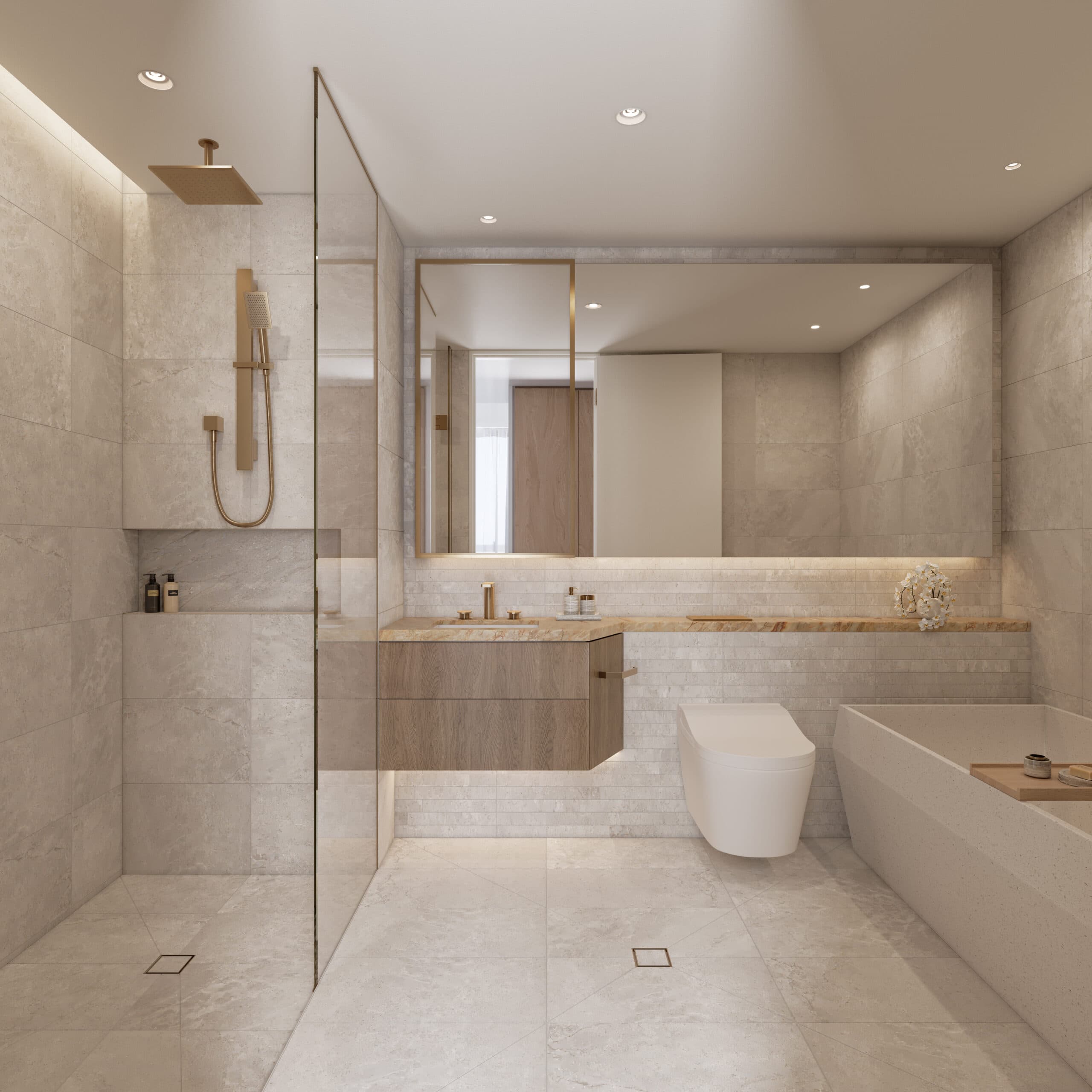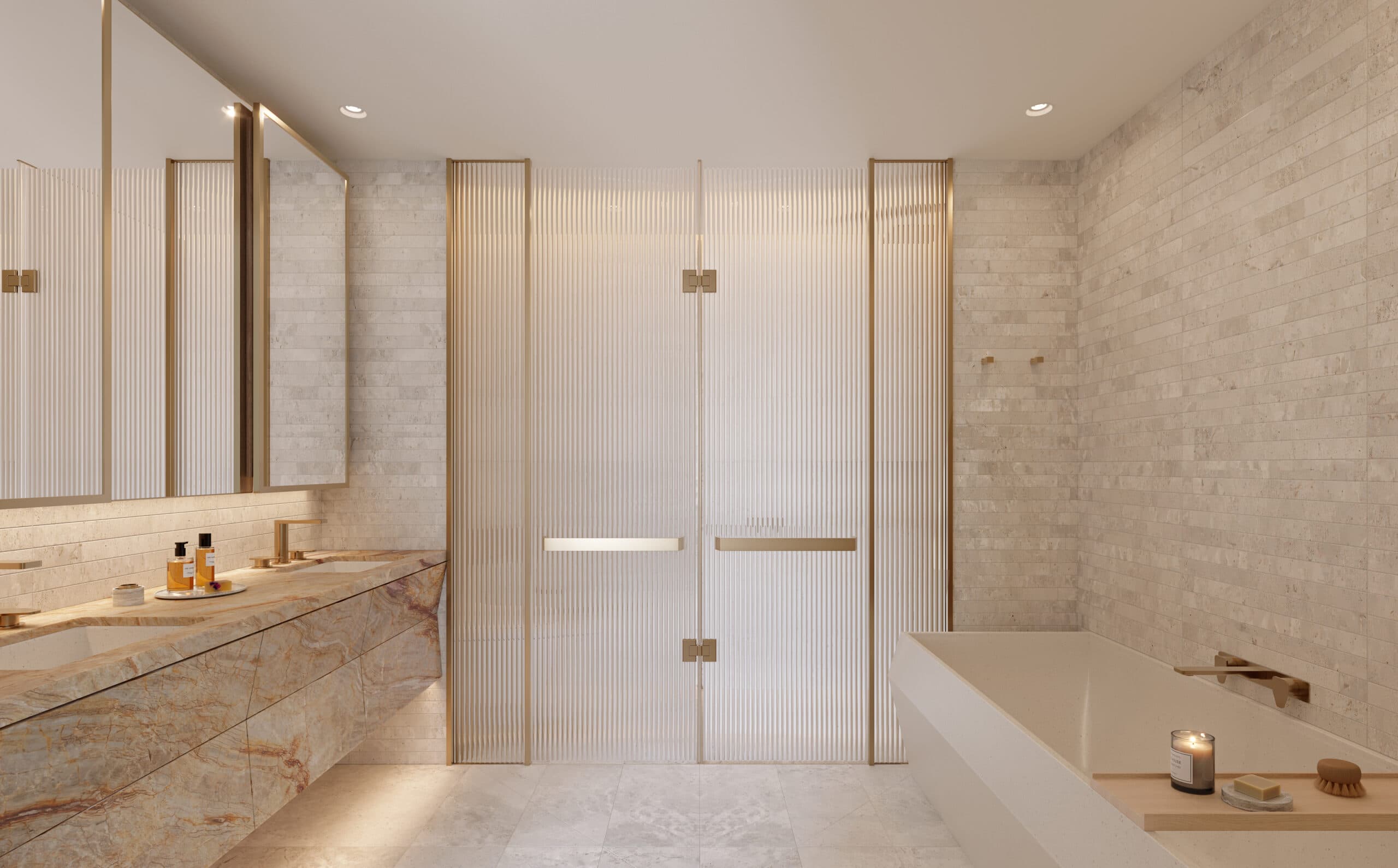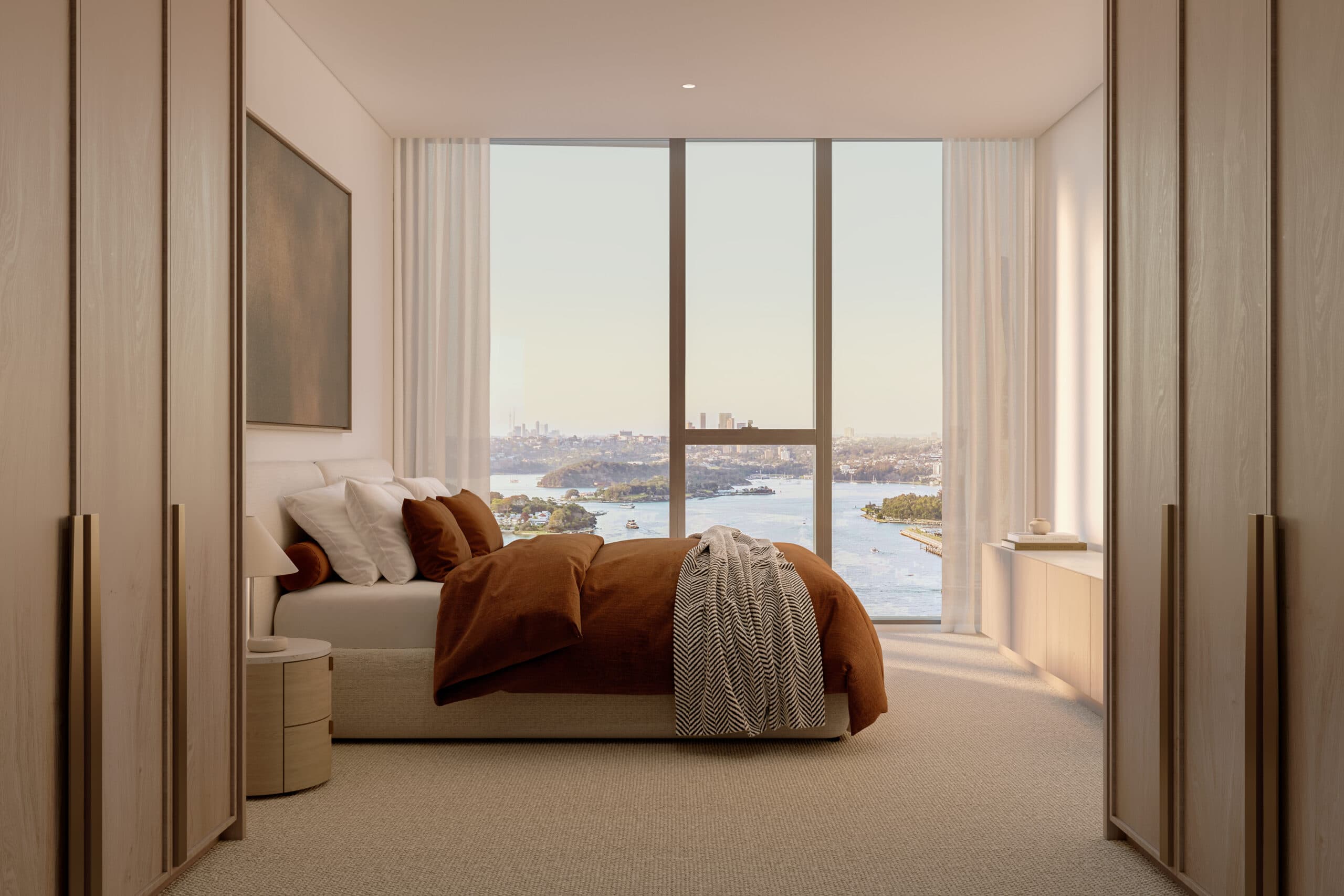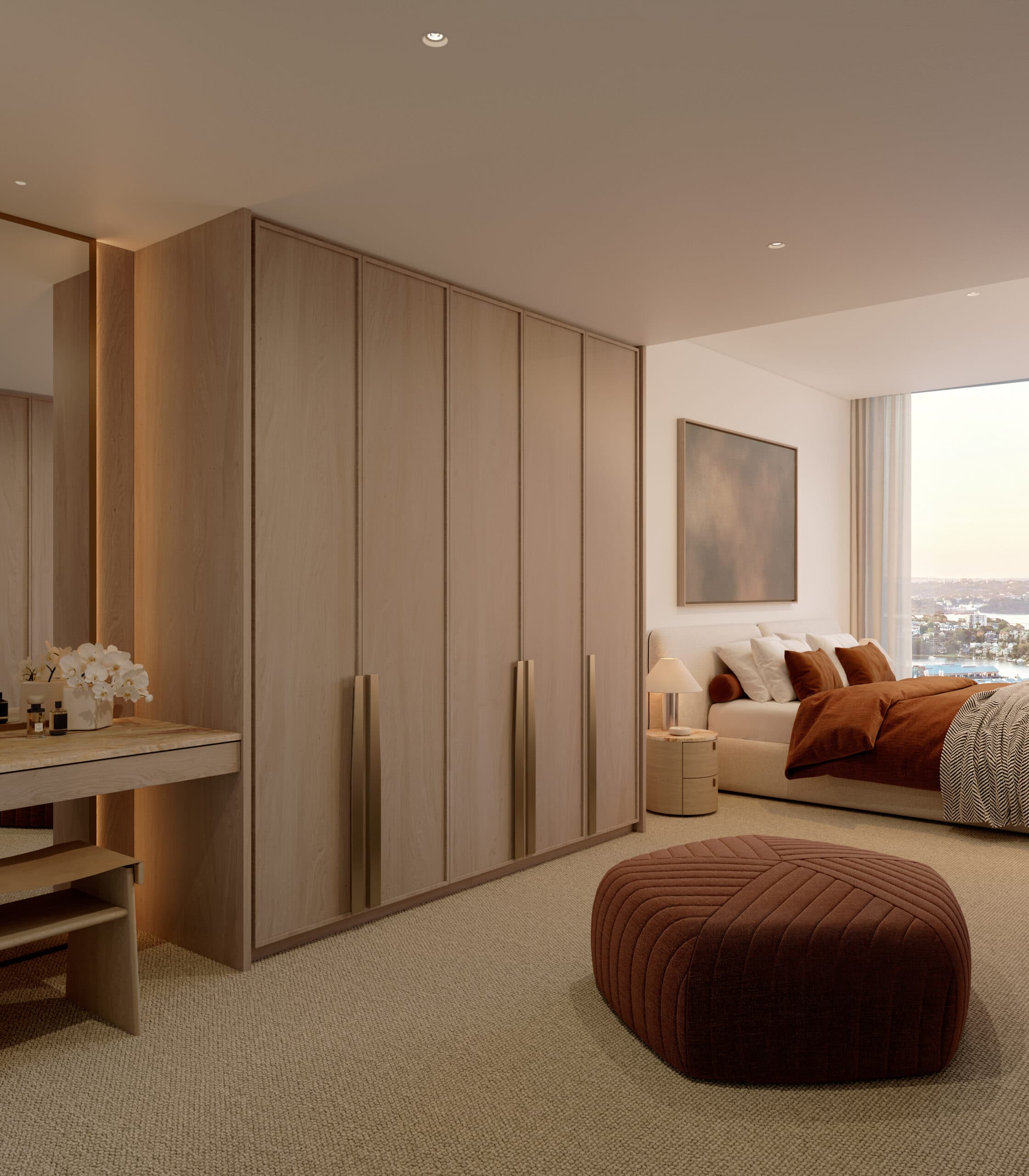 The intent is to create serene apartments that allow the views to remain the true centrepiece. Across 263 residences — from one-bedroom apartments to expansive sub-penthouses and two-storey penthouses — interiors are defined by restraint and crafted detail. Two palettes draw on Sydney’s natural setting: one featuring green shades, alluding to the harbour foreshore, the other infused with ochre tones referencing local sandstone geology. Sculptural quartzite and marble are focal points in kitchens and bathrooms, their raw beauty refined and controlled.