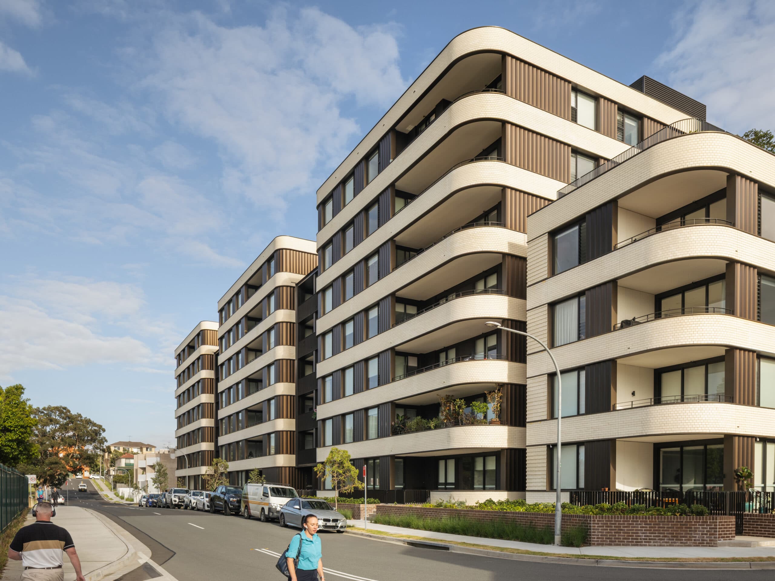 The apartment building expresses a series of rounded cube-like volumes with recessed balconies that break down scale. Four vertical circulation cores maximise apartments with good solar access and dual aspect for natural cross-ventilation. A communal rooftop terrace atop the eastern wing provides city views, landscaped rooms and a barbecue area.