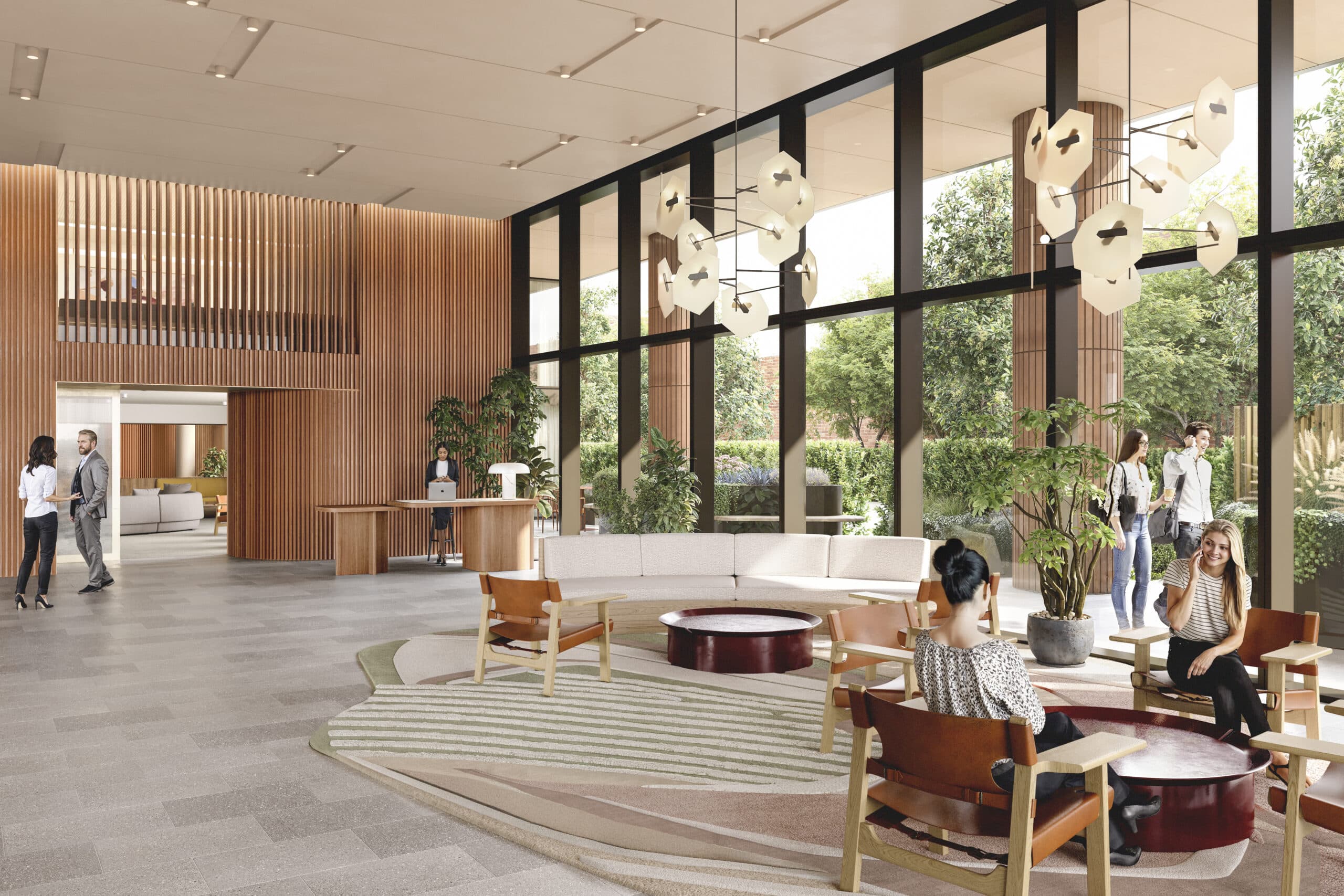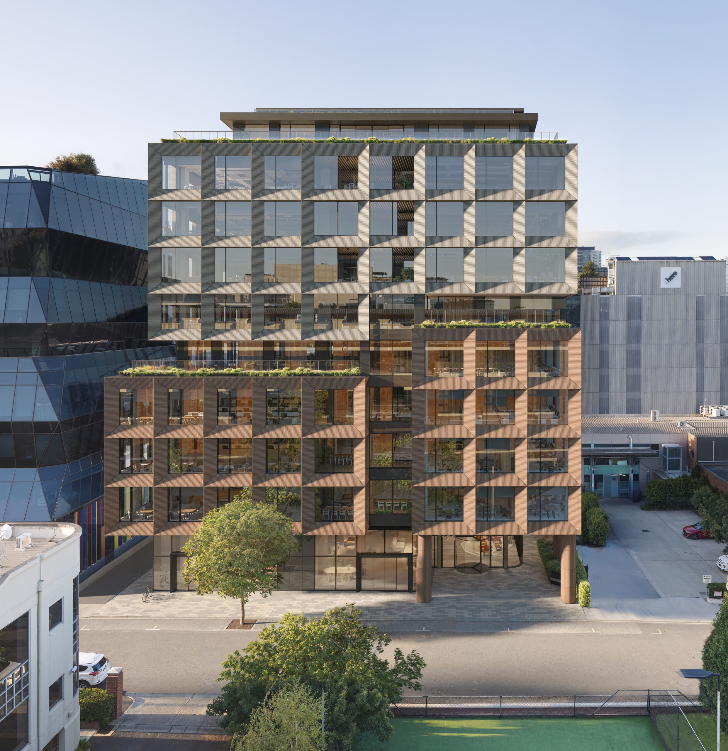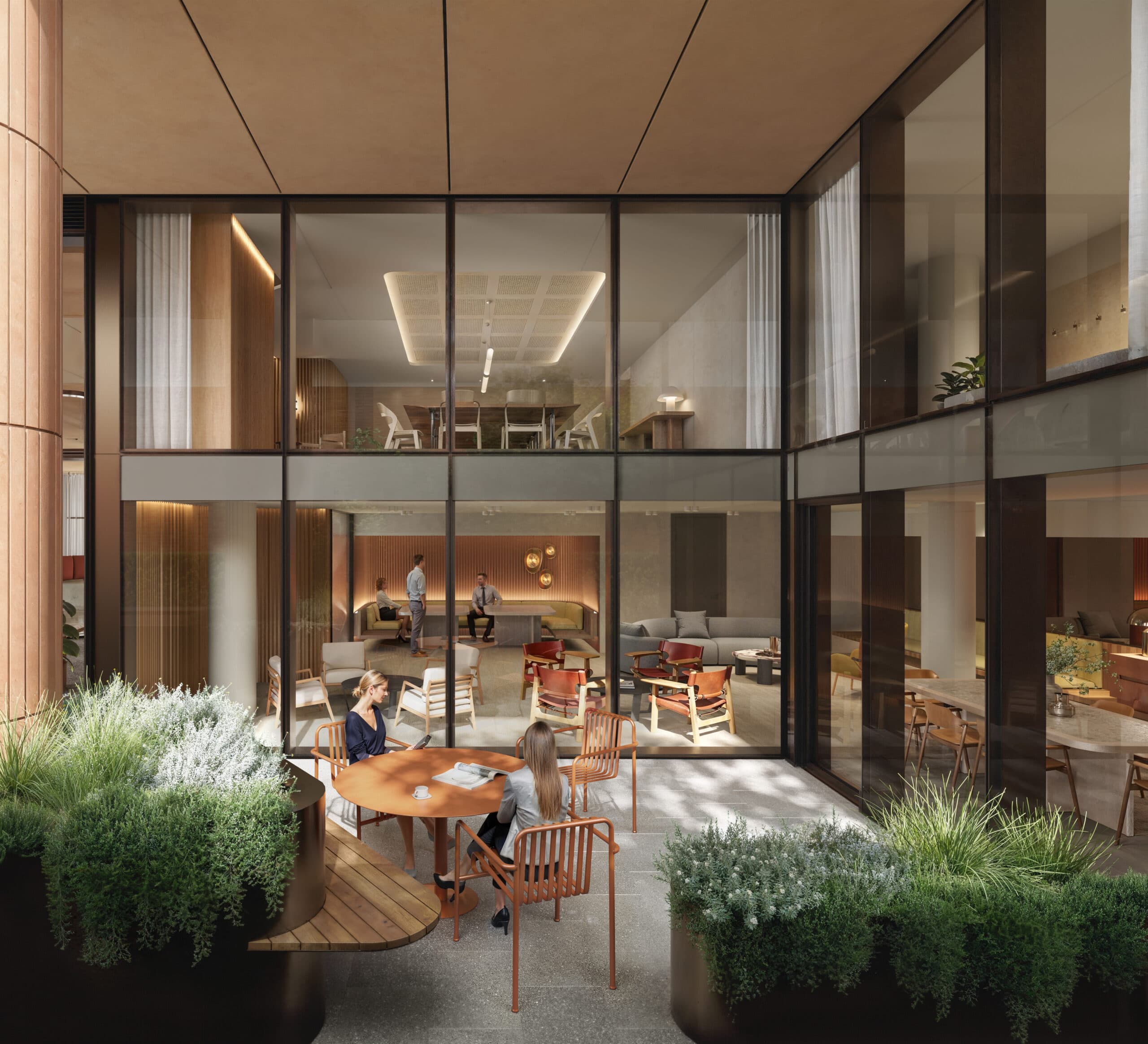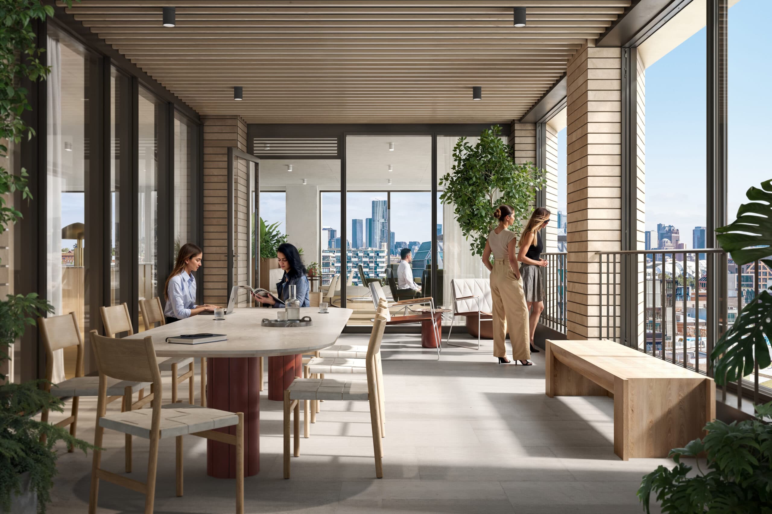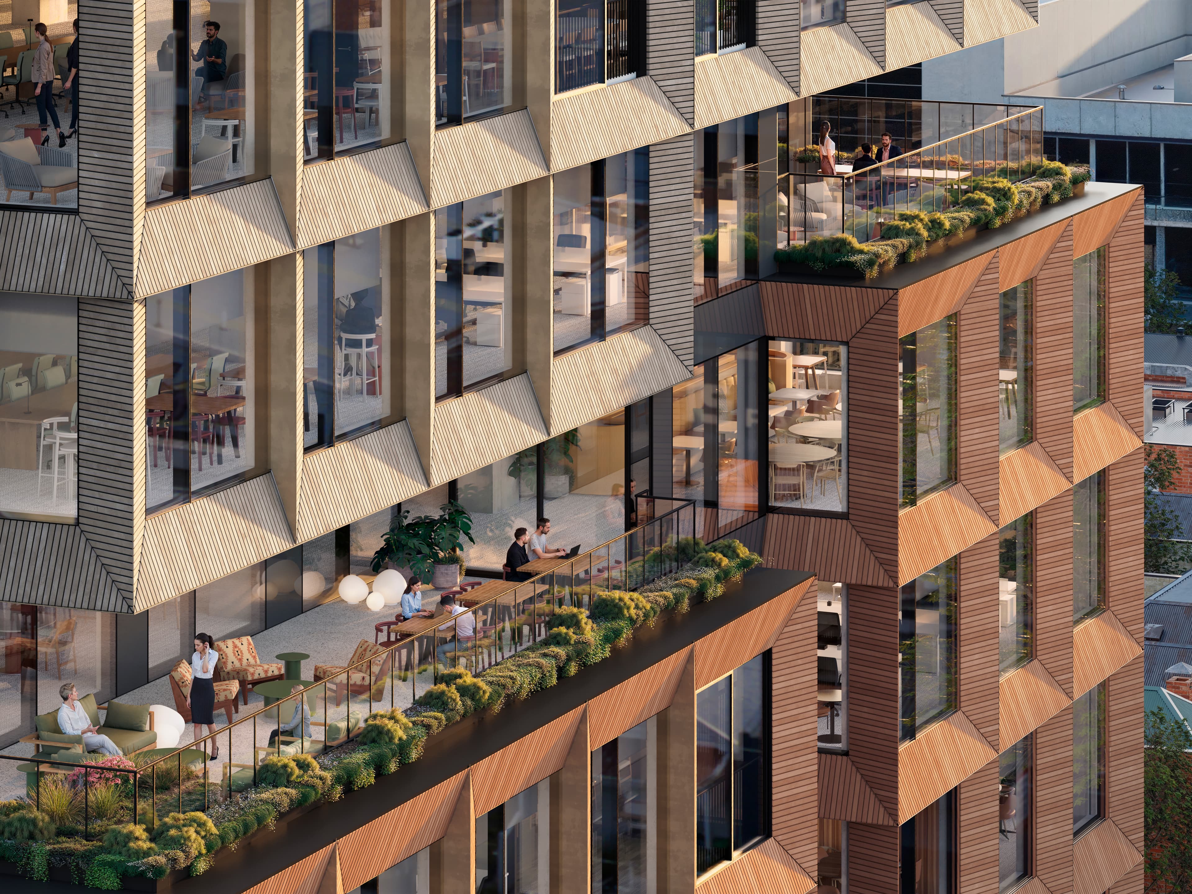 Deep-set terracotta frames and expansive glazing give the façade a sculptural rhythm, while wintergardens and terraces on each level bring light, air and greenery into the workplace. Outdoor terraces feature operable façades and integrated planter boxes, creating immersive settings for work and relaxation, flexible floorplates are designed for efficiency and connectivity.