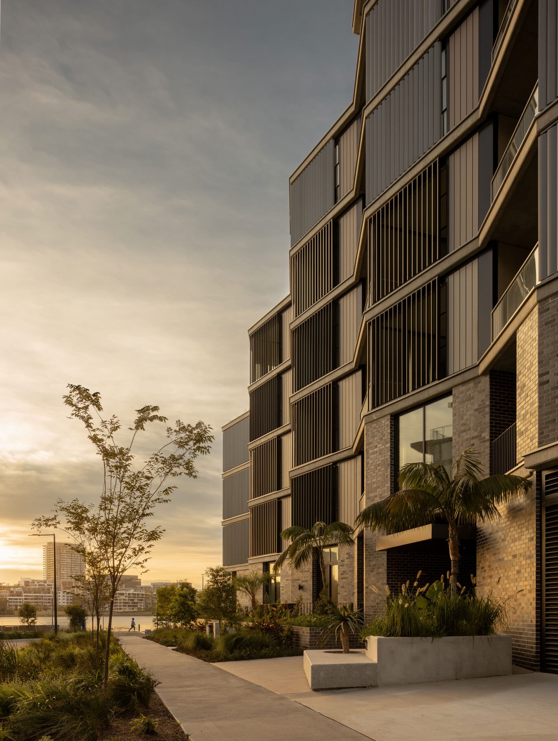 A U-shaped perimeter block is organised around a landscaped courtyard and opens out to address Homebush Bay. A 30m wide foreshore provides a new public open space, encouraging pedestrian and cycle routes along the promenade.