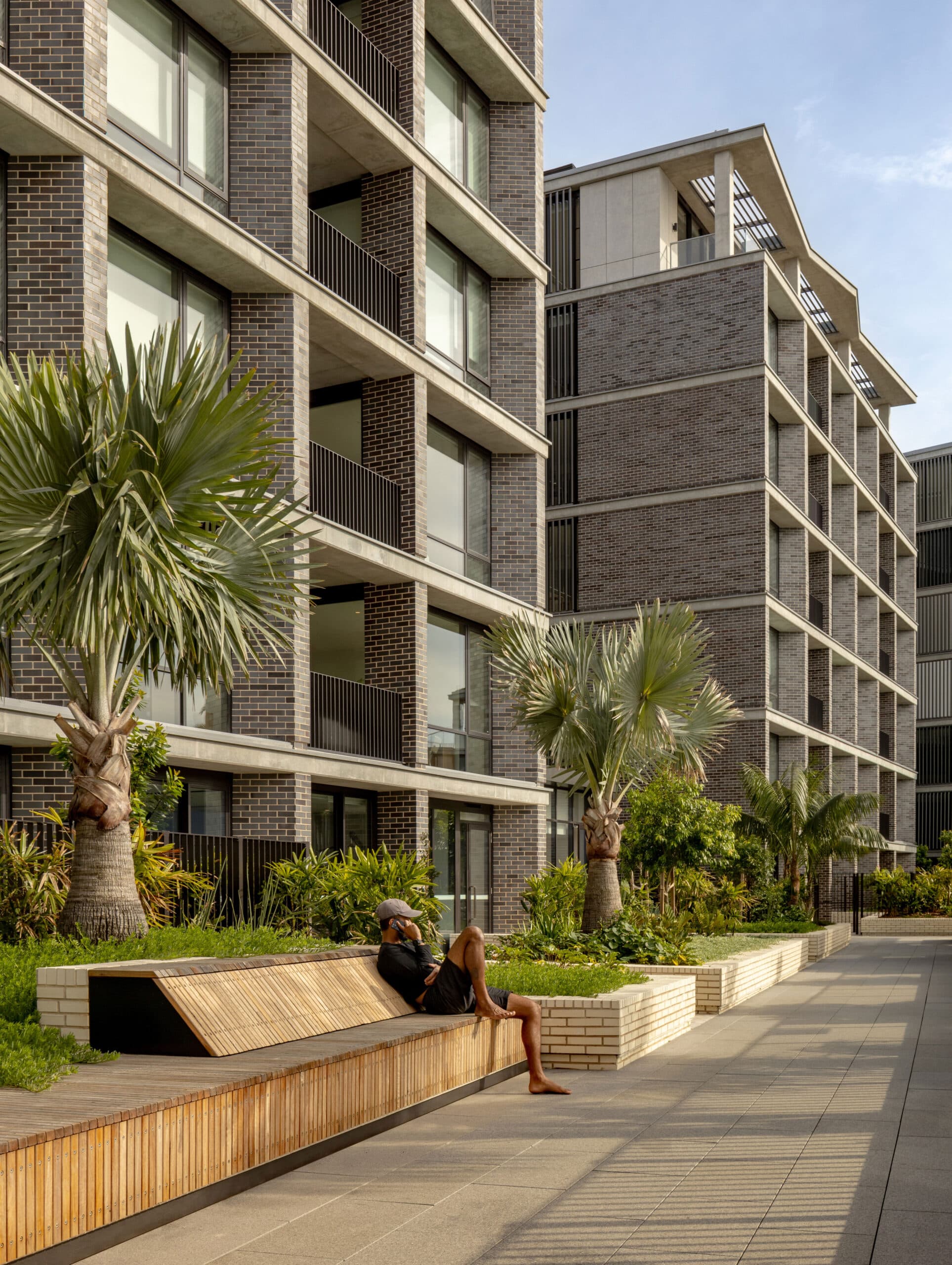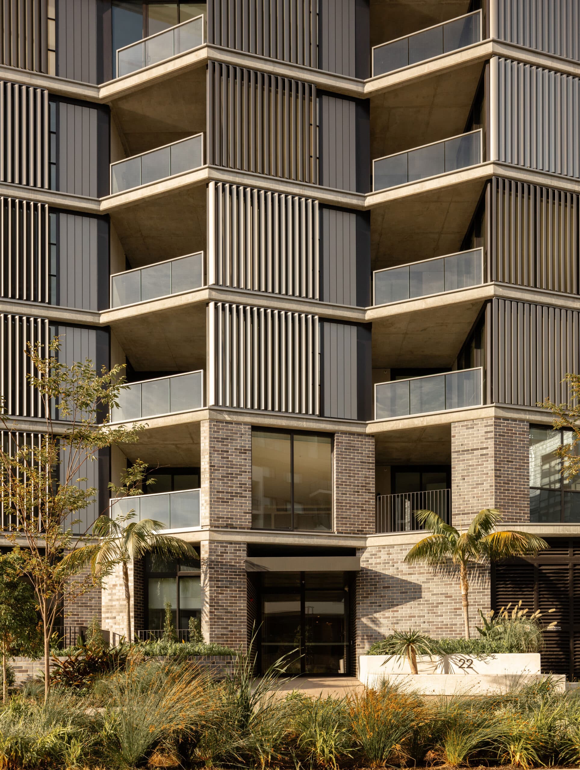 Buildings have a solid, masonry base that introduces a distinct street interface. This brickwork extends up the volumes fronting Marine Parade. Deep brick piers separate room modules from balconies, while expressed concrete horizontals provide shading. All facades perpendicular to the foreshore line are facetted, opening apartment views to the water. Vertical louvres provide privacy and protection from low-angle sun.
