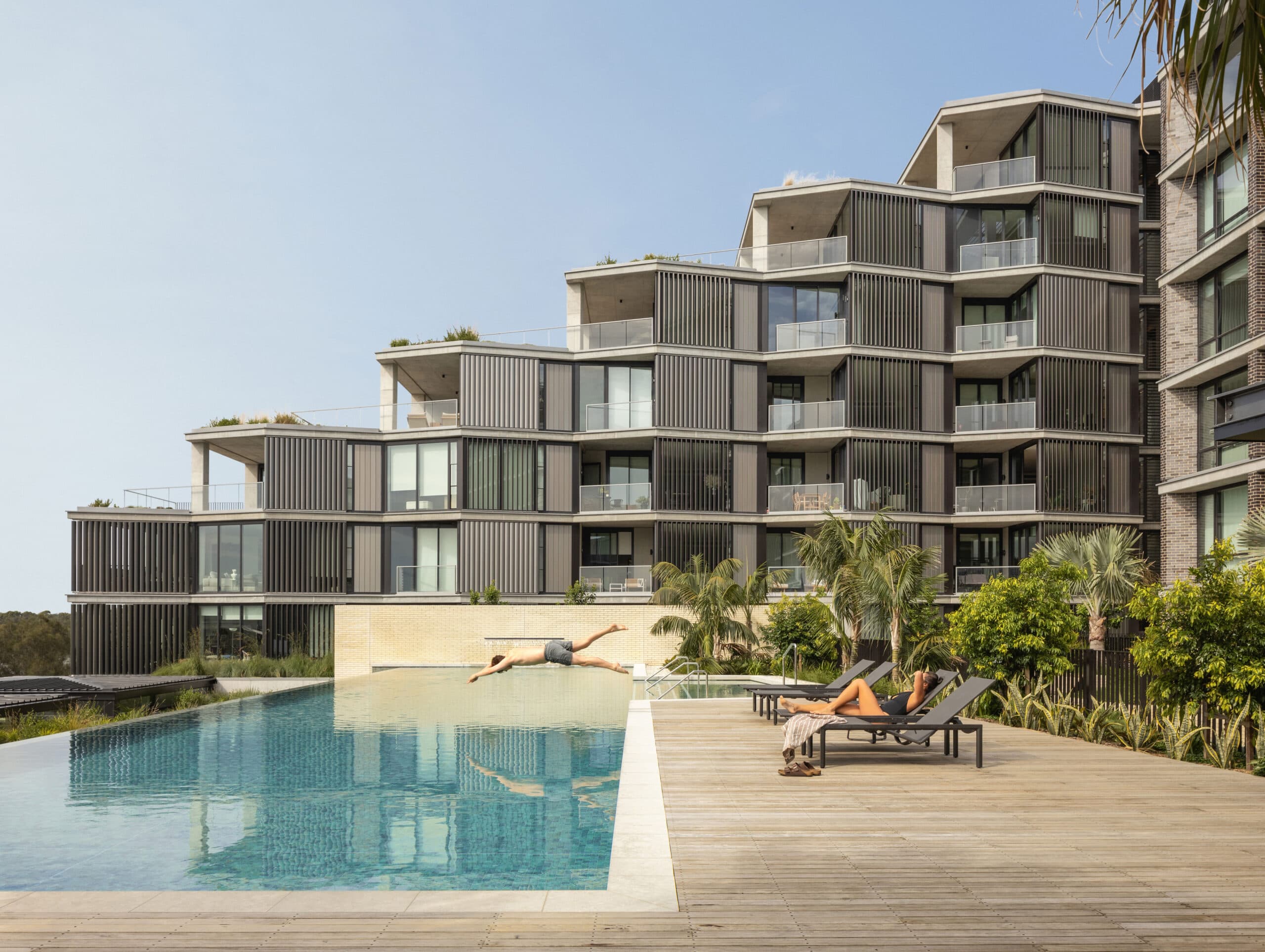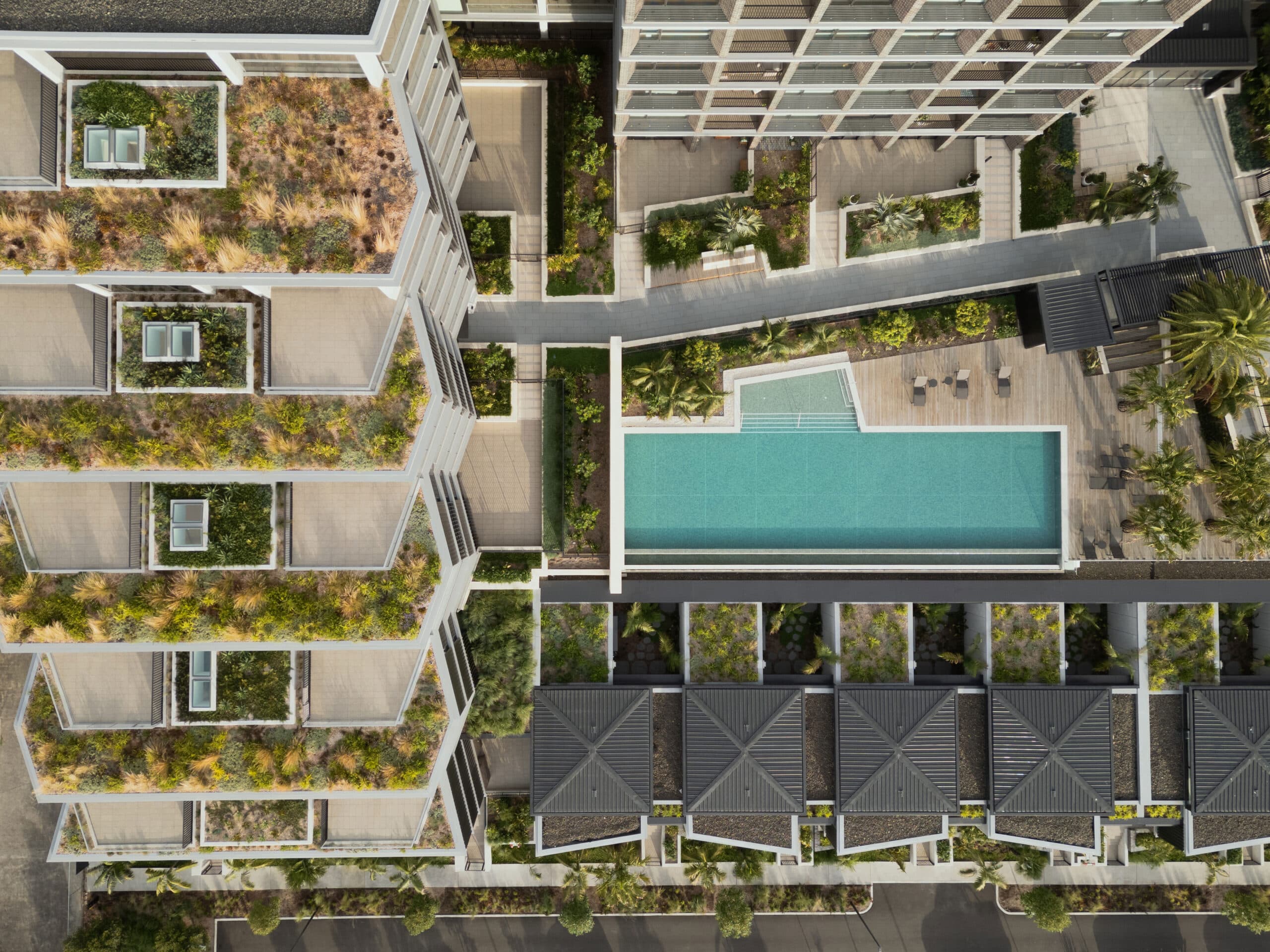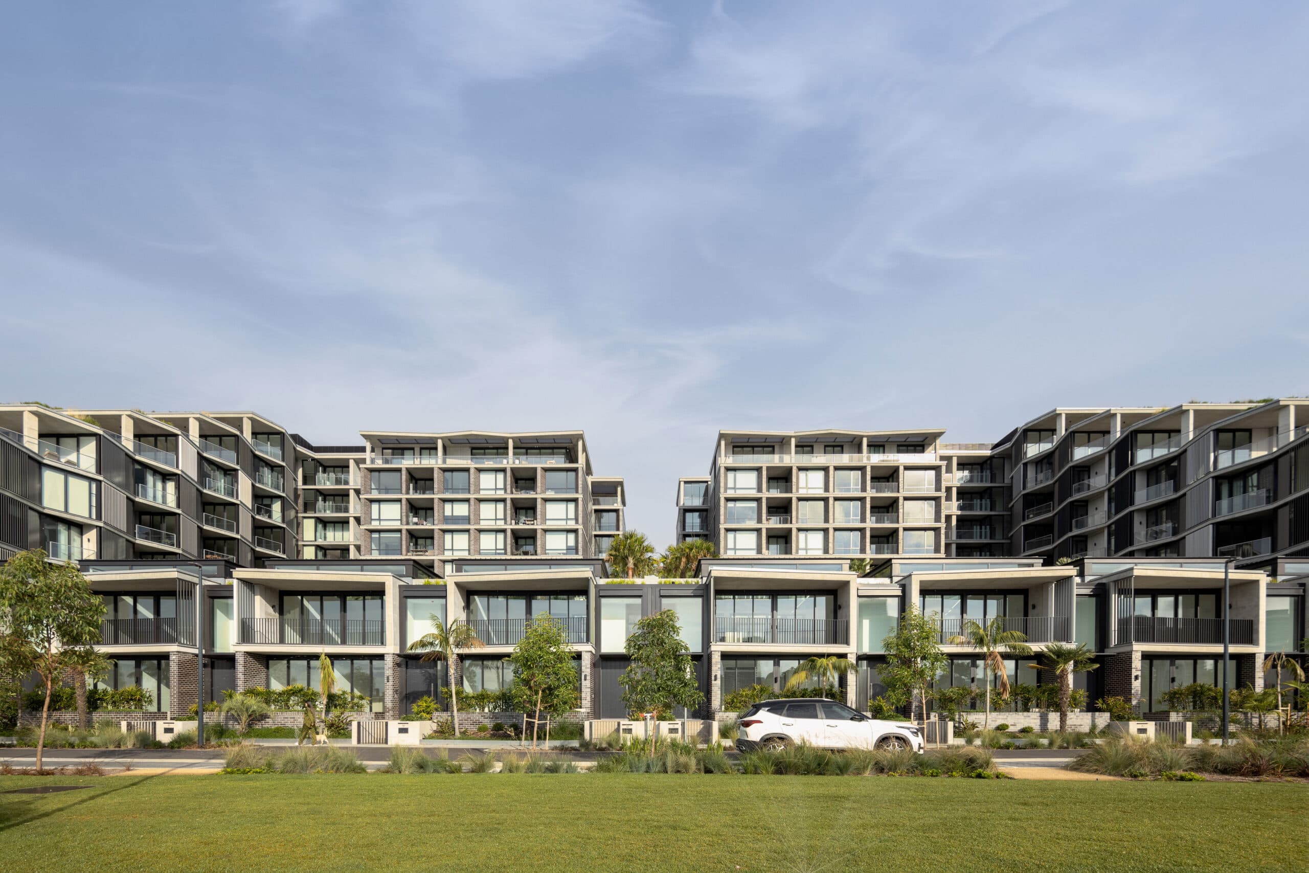 The built form is broken down into two L-shaped buildings, which sit atop a sleeved podium carpark. Buildings step down in height from 8-storeys to 4-storeys. This stepping reduces overshadowing to the foreshore, maximises views over Homebush Bay and delivers apartments with large, landscaped terraces. The buildings are further articulated into two volumes along Marine Parade, plus a two-storey foreshore element comprising the townhouses.