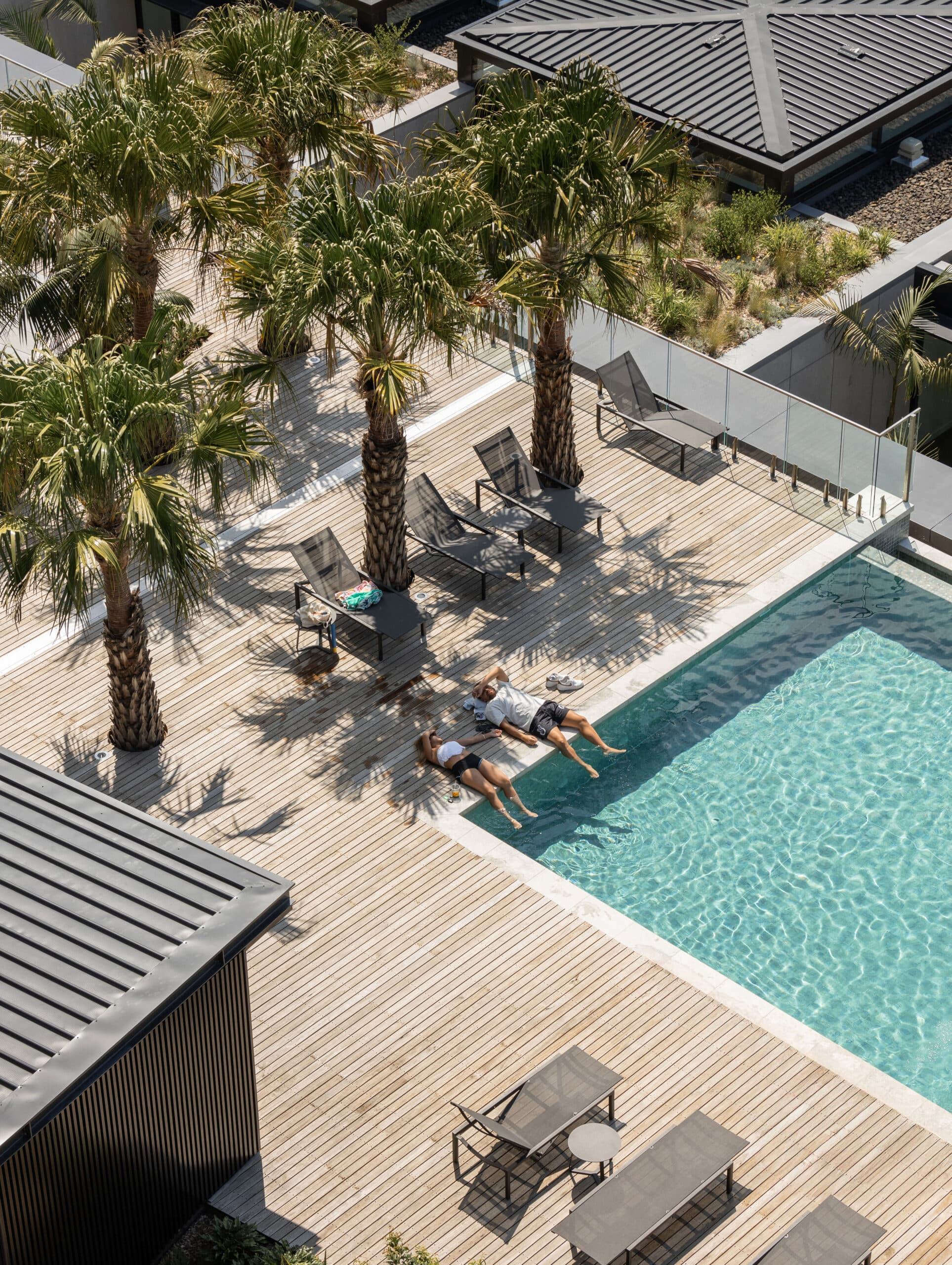 Diverse amenity spaces create opportunities for community interaction. The generous landscaped courtyard accommodates an outdoor pool, lawn and shaded alfresco dining area. A double-height space with an open stair connects the courtyard back to the main lobby via a co-working space. Additional communal amenities on the top level include a private kitchen and dining room, a residents lounge, a media room, outdoor living areas and a BBQ terrace.