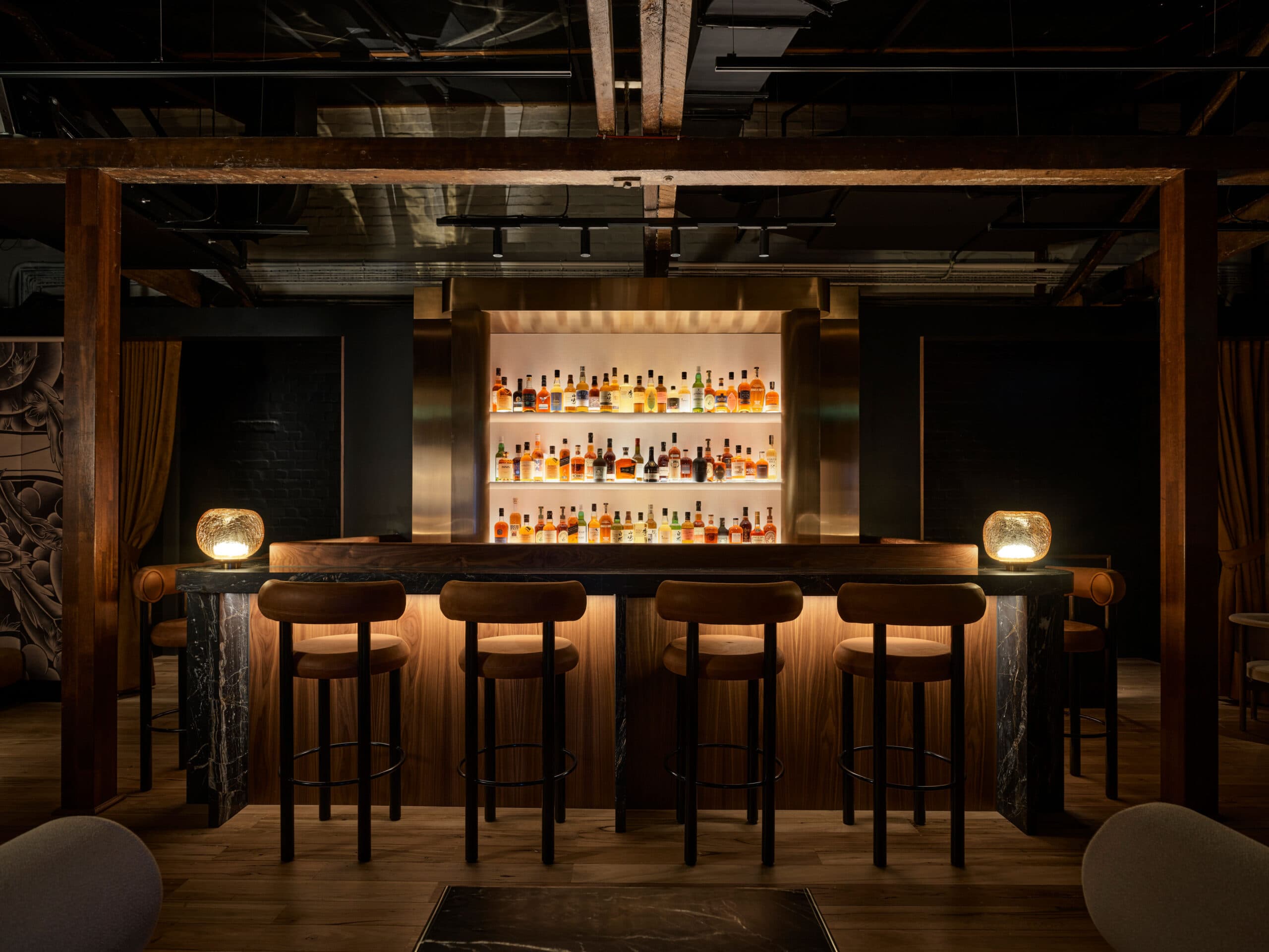 The copper-clad bar, inspired by traditional whisky stills, forms a glowing focal point that anchors the space. Textured timbers, soft lighting, and custom lounges upholstered in tattooed fabric referencing Japan’s Yakuza culture create a warm, edgy atmosphere.